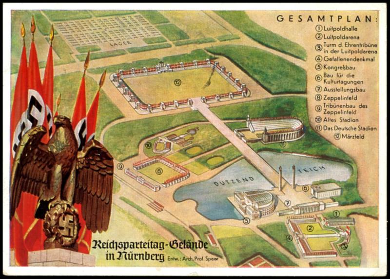 1938, Nuremberg Nazi Party Congress, topic "master plan Nazi Party Congress Terrain in Nuremberg", multicoloured picture postcard, used. (Image 1)(Image)