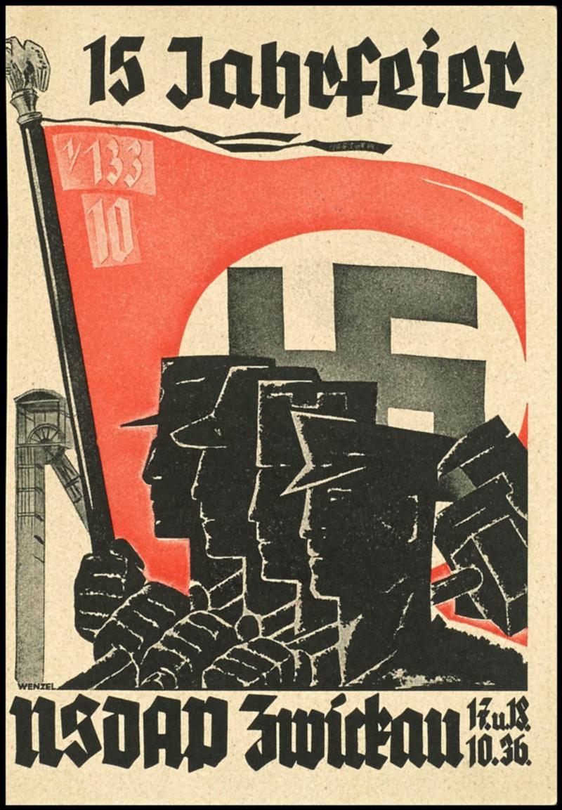 1936, 15 years NSDAP Zwickau, multicoloured card "men with flag before pit wheel", mailed to Oschatz, special cancel "Zwickau 18.10.36" (Image 1)(Image)