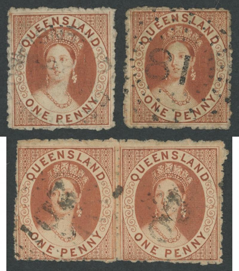 1897-98 Figures in All Corners 2d deep blue with Major Cracked Electro Vertically from the Queen's Brow to the Base of Her Neck ACSC Q16d (SG 235a) Advanced States on Tattersalls covers to Hobart comprising in pair from 'TEXAS', with 1d (manuscript "X" cancel) & another 2d from 'CHARLEVILLE' also with 2-line 'REGISTERED/...' handstamp, and in a block of 4 + 3d on long (folded) cover from 'NORMANTON' also with 2-line 'REGISTERED/...' handstamp, filled spikeholes as usual. The second item was sold at our auction of 1.12.2019 for $227 (Sale 239 Lot 1671).