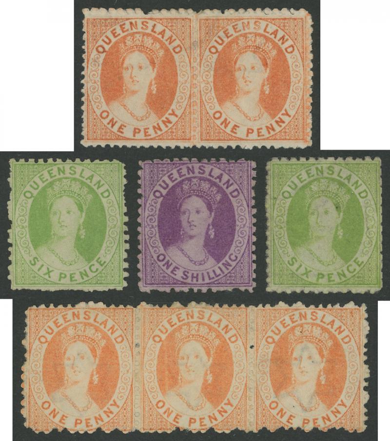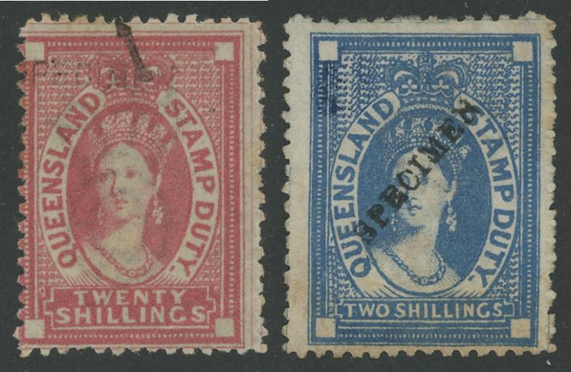 POSTAL FISCALS: 1866-68 Wmk Large Crown/Q 1d, 6d brown, 1/-, 2/-, 2/6d, 10/- & 20/- (ink mark on the face) all with sans-serif 'SPECIMEN' Handstamp, large-part gum, and 2/- with seriffed 'SPECIMEN' Overprint Diagonally, no gum.