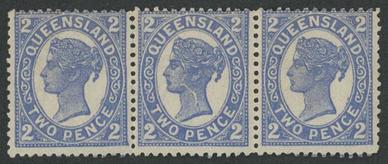 1897-98 Figures in All Corners 2d deep blue with Major Cracked Electro Vertically from the Queen's Brow to the Base of Her Neck ACSC Q16d (SG 235a) Latest State showing the Full Extent of the Crack being the central unit in a horizontal strip of 3, characteristic light gum-bends, unmounted, Cat $330+ (£215+) for mounted singles. (Image1)