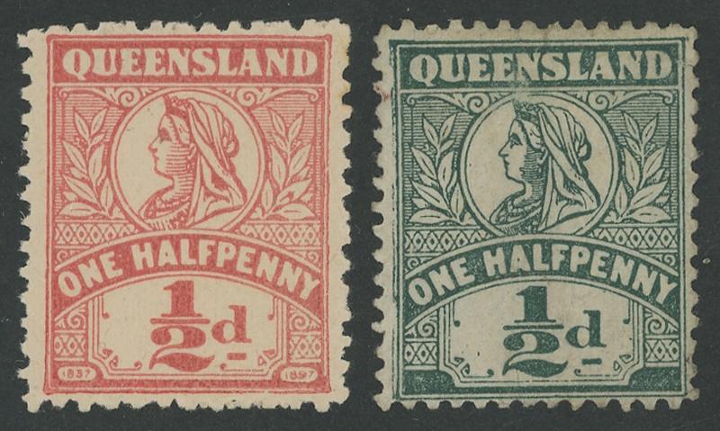 1897 Diamond Jubilee ½d Widow's Weeds essay with '1837 - 1897' in the lower corner tablets, in rose-pink on ungummed unwatermarked paper. Scarce. [The issue was not proceeded with but the design - with the dates removed - was issued as a definitive, for which a perforated plate proof in the issued colour on ungummed unwatermarked paper is included] (2) (Image1)