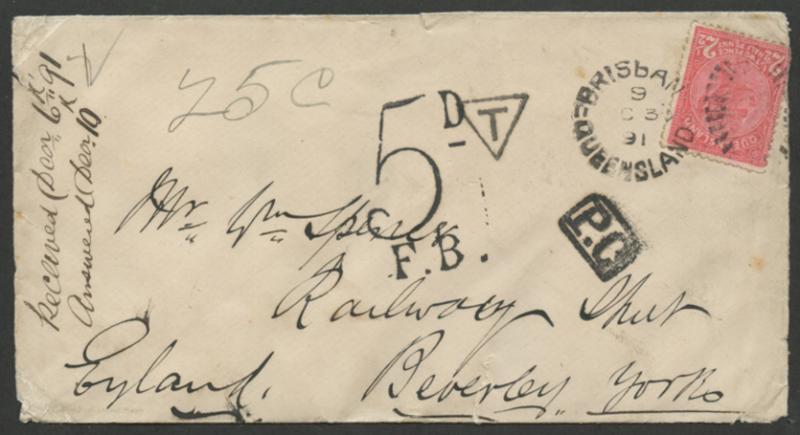Consignment remainders including 1888 cover endorsed "Tender for carriage & Engine Sheds/Emu Park Railway", 1891 (Oct 30) overweight cover to Yorkshire with 2½d rosine only & superb '5D/FB' handstamp of London (UPU rate introduced 1.10.1891), 1907 cover to USA correctly franked with 2½d purple/blue but curiously with very fine '5/CTMS' handstamp & US Postage Due 2c tied to the reverse, a few Commonwealth period postmarks, 1931 airmail 'THURSDAY ISLAND' to Canada via Japan with huge cachet on the reverse signed by the pilot "Francis Chichester", and Victoria 1856 entire to "Borough Distillery/London" with Woodblock 6d pair (margins just shaved to large), fine to very fine.