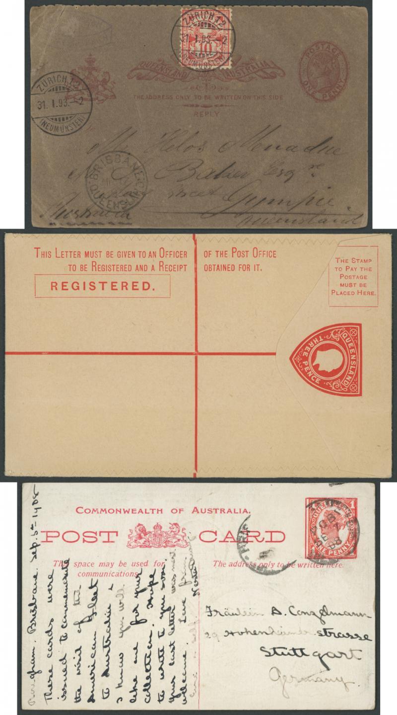 POSTAL STATIONERY: Eclectic batch including 1889 1d Postal Card to GB with superb 'GAYNDAH' cds & Rays '98', 1898 STO 1d Envelope with BN '472' & 'WOOLLOONGABBA' cds, 1908 Visit of the US Fleet 1d Postal Card to Germany (½d stamp lost otherwise very fine), 1910 PPC with Esperanto message to Bulgaria, KEVII 3d Registration Envelopes with imprint of McCorquodale or De La Rue both unused, Postal Cards on exhibit cards including 1893 1d Reply-Half used from Switzerland (rare but defective), etc, condition variable.