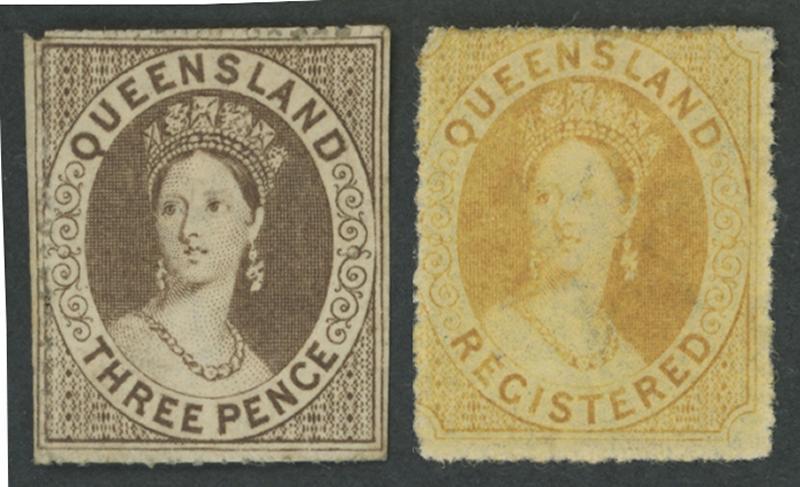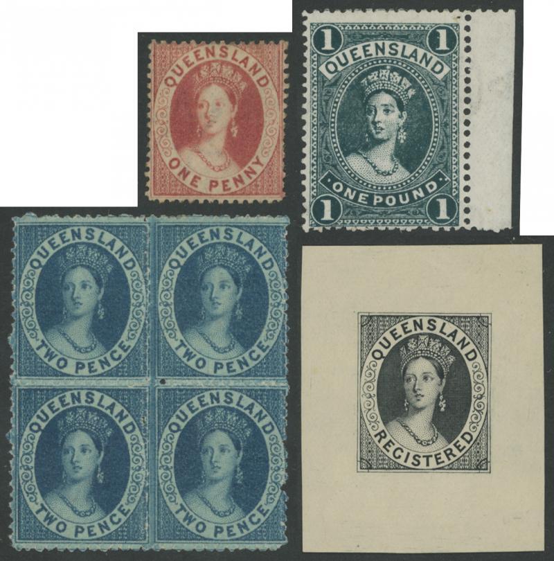 Group including 1862 entire to Edinburgh with QV Chalons Imperf 6d green solo (not convincingly tied), 1866 to England with Chalons 6d green (Grossly Misplaced Perfs) tied '85' Rays of Drayton, 1871 to England with Chalons 2d blue strip of 3 tied '131' Rays (RR) of Caboolture, 1876 to Scotland with Chalons 2d blue & 6d green tied '96' Rays of Maryborough, plenty of other postmark interest noted 'LEYBURN' superb backstamp on 1861 envelope (stamp excised), 1904 Barred Numeral '544' two strikes tied to 'DUNWICH' cds all in blue, 1905 'Aborigines' postcard to Glasgow with ½d & 1d tied 'BAJOOL' cds, Tatts covers with 'REGISTERED/...' handstamps from Capella, Fortitude Valley, George Street & Longreach and various TPO markings, taxed items, 1911 from England with 'UNCLAIMED/BRISBANE' oval datestamp, Postal Stationery unused & used, etc, condition a little variable but most are quite presentable.
