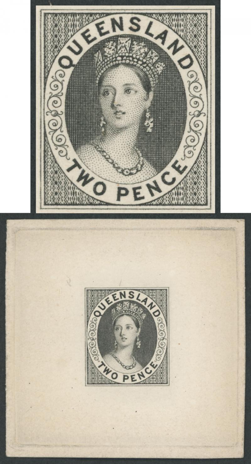 1860 QV Chalons Large Star Watermark 2d die proof in black on thin card (56x56mm) showing the outer border of the die on all sides. A rare and beautiful example of the engraver's art. Ex Perkins Bacon Archives, General Robert Gill and Ron Butler: sold in 2004 for £6900. (Image1)