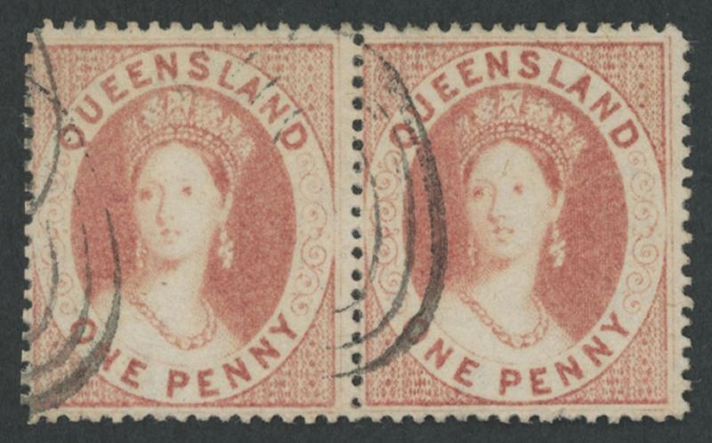 1860-61 QV Chalons Large Star Watermark Clean-Cut Perf 14-16 1d carmine-rose SG 4 horizontal pair, delicate shade, concentric-ovals cancels clear of the face on both units, Cat £800+ for singles. Superb and rare multiple. Ex Charles Lathrop Pack and Dale-Lichtenstein. Sold at our auction of 23.9.2011 for $873 (Sale 168 Lot 225). (Image1)