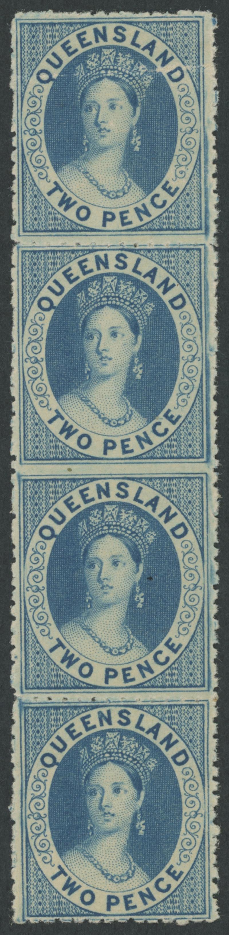 1862-67 QV Chalons No Watermark 2d blue vertical Imperforate Horizontally between the Second & Third Units SG 24c in a strip of 4, minor faults on the upper & lower normal units but the variety pair is superb with virtually full gum, Cat £8000+ for a pair. Ex 'Mayfair Find' from a part-sheet of 106 that included two rows - 12 vertical pairs - Imperforate Between, and William Frazer: sold in 2004 for £3450. Gary Diffen's block of 8 with two imperf-between pairs - minor tonespots - sold for £9000. A pair graded 'B' sold at our auction of 6.12.2023 for $2805 (Sale 254 Lot 3209). (Image1)