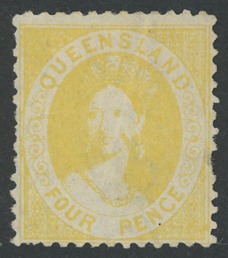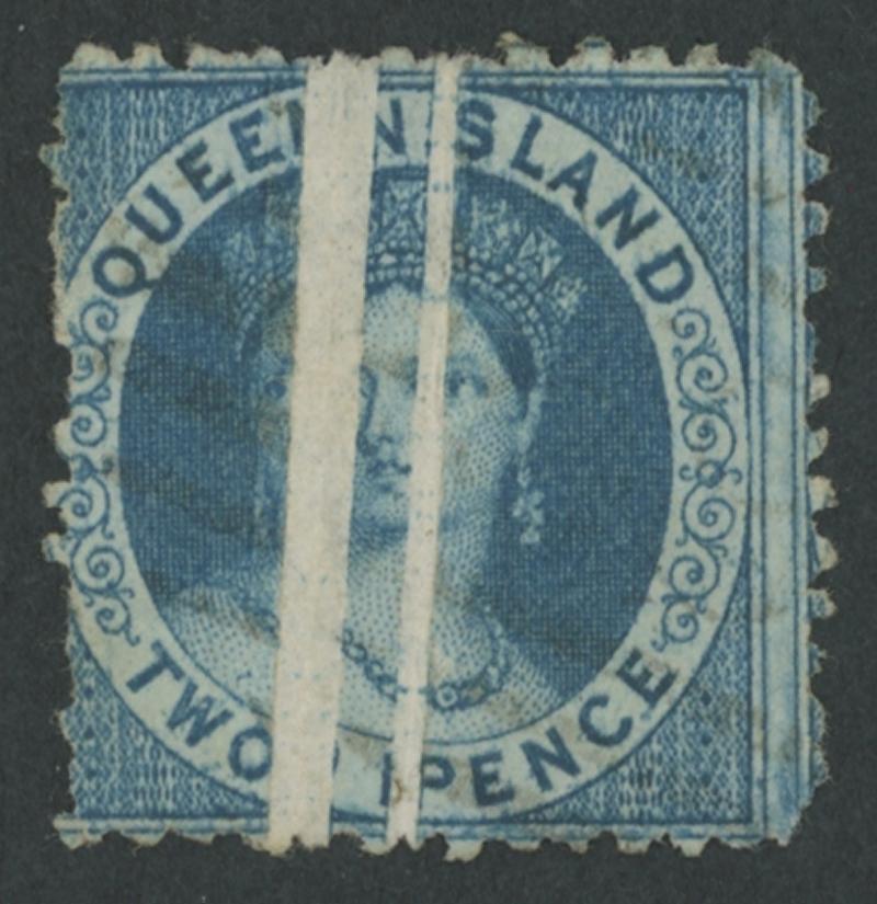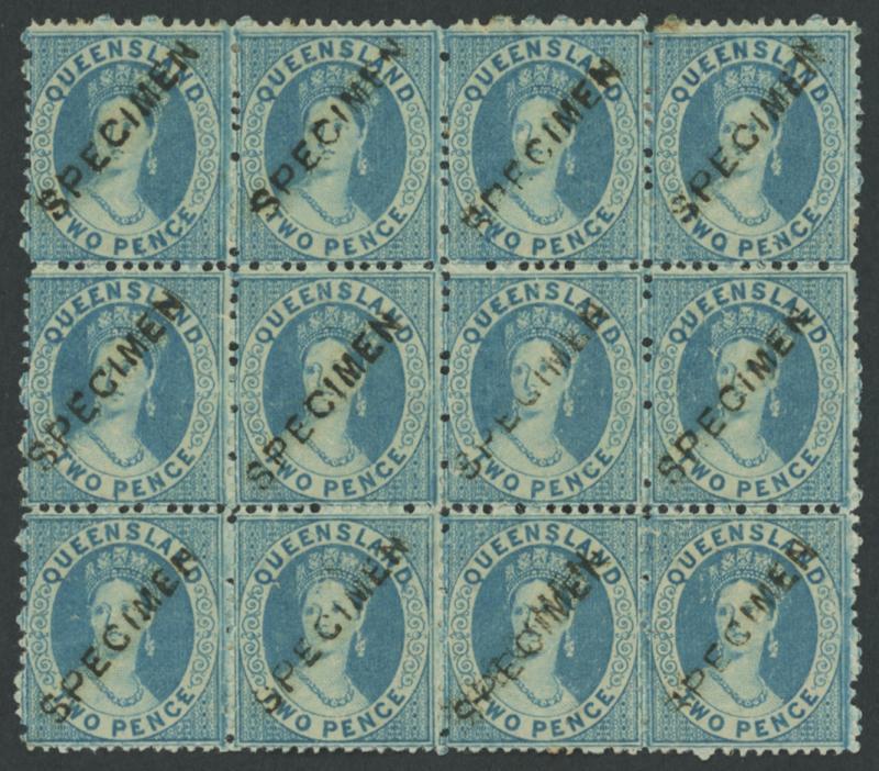 1866 QV Chalons 'QUEENSLAND/POSTAGE...' Watermark 2d blue SG 52 block of 12 (4x3) with central '...UEENS...' Watermark, each unit with diagonal sans serif 'SPECIMEN' handstamp, large-part gum. Blocks showing significant parts of the sheet watermark are very scarce. Sold at our auction of 26.11.2005 for $1045 (Sale 119 Lot 386). (Image1)