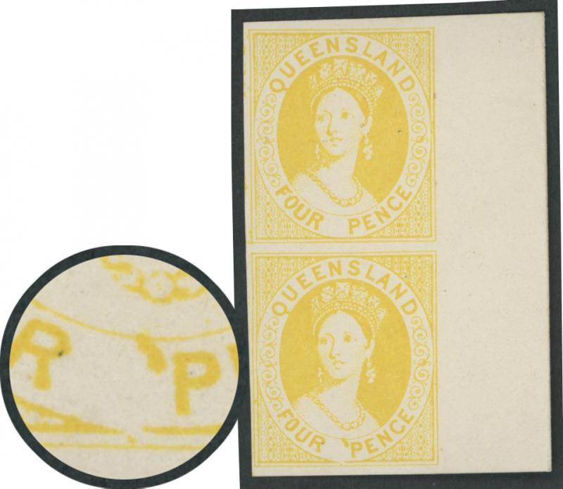 1868-78 QV Chalons Crown/Q Watermark '5' 4d imperforate plate proof marginal vertical pair in bright yellow on ungummed unwatermarked surfaced stock from the right of the sheet, the lower unit with Large Apostrophe before 'PENCE' and Frame Break at the Base of the Outer Oval, margins clear to huge with complete outer framelines. Superb. A very scarce proof. This item may actually date to the original Litho 4d of 1866 SG 53-56. (Image1)