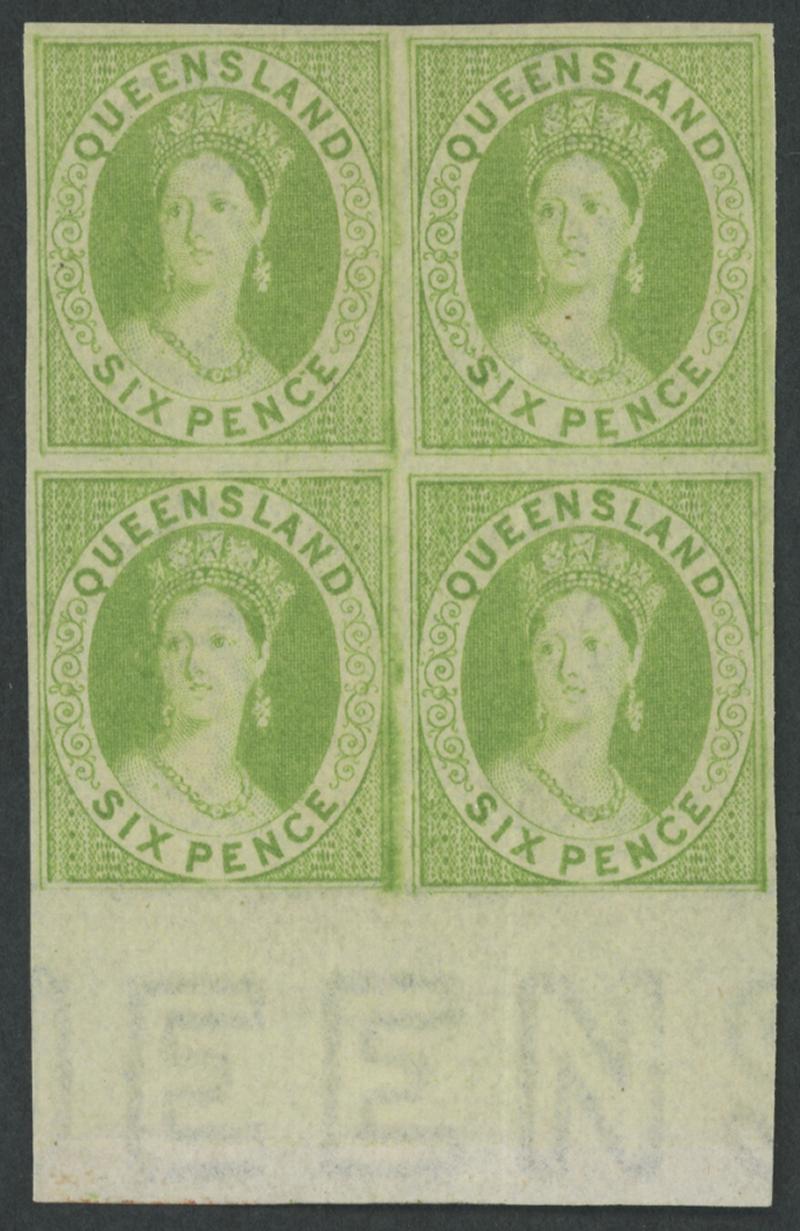 1868-78 QV Chalons Crown/Q Watermark '5' 6d pale apple-green marginal imperforate block of 4 SG 92a from base of the sheet, marginal '...UEENS...' watermark, unused, Cat £1900+ for two pairs. Gorgeous and superb. Ex Marcel Burrus, Richard Stevenson and Bernie Manning: sold for $5825 (Sale 128 Lot 274). The Dale-Lichtenstein/Robert Jenkins non-marginal block of 4 sold for $4140 at our auction of 10.3.2007 (Sale 127 Lot 2453) and again for $3495 at our auction of 2.5.2014 (Sale 190 Lot 1382). Gary Diffen's adjoining block of 6 (3x2) with '...SLAND...' watermark sold for £1920. (Image1)