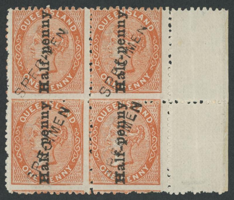1880 QV First Sidefaces Surcharge 'Half-penny' on 1d reddish-brown Die I SG 151 marginal block of 4 from the right of the sheet, each unit with diagonal 'SPECIMEN' handstamp in black, characteristic rough perfs, large-part gum & the lower units are unmounted. A rare multiple. Ex Bernie Manning: sold for $845 (Sale 146 Lot 1049). (Image1)