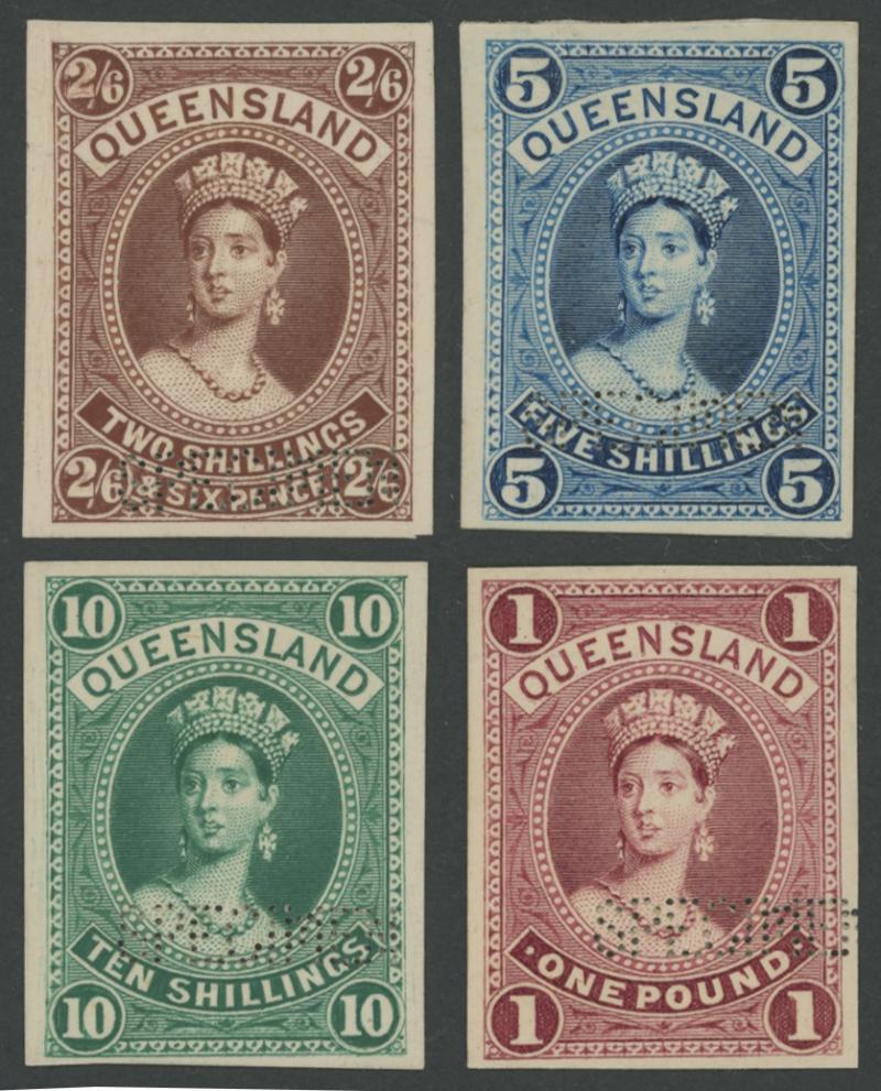 1882-95 QV Large Chalons 2/6d in chocolate, 5/- in steel-blue, 10/- in deep blue-green (close to the issued colour for the Pound) and £1 in plum imperforate plate proof singles on thin card each with very fine 'SPECIMEN' perfin of 80 holes, margins close to large. Rare. The 2/6d and 10/- are ex Bernie Manning: sold for $875 each (Sale 146 Lot 1063 & 1065). The £1 is ex 'Becancon' (I): sold for SFr460. (4) (Image1)