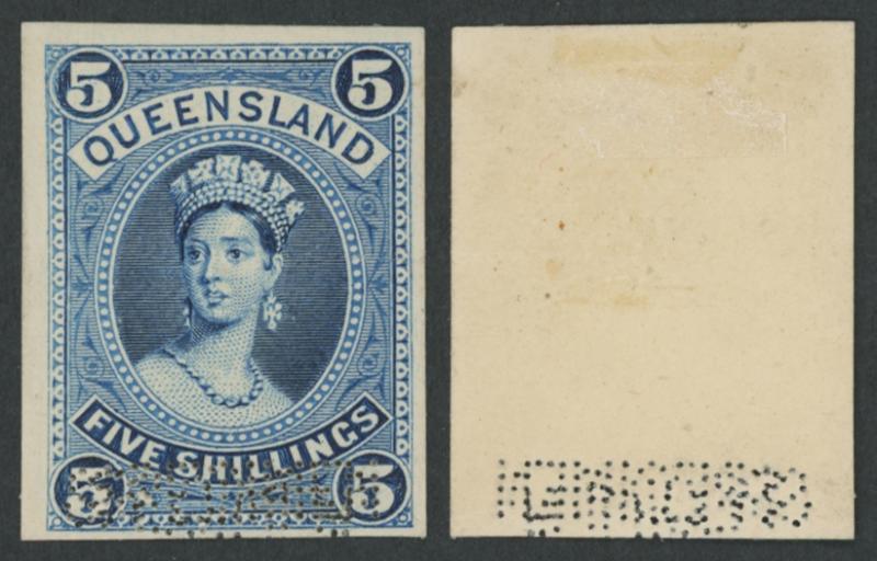 1882-95 QV Large Chalons 5/- imperforate plate proof single in steel-blue on thin card with very fine 'SPECIMEN' perfin of 80 holes remarkably with Double Puncture, margins close to large. Rare. Ex Bernie Manning: sold for $1455 (Sale 146 Lot 1064). (Image1)