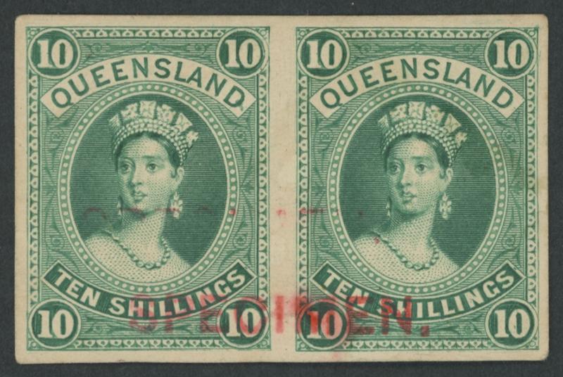 1882-95 QV Large Chalons 10/- imperforate colour trial pair in unadopted colour of blue-green (similar to the adopted colour for the Pound) on thin card, good even margins, poor strike of an unusual sans-serif 'SPECIMEN.' Handstamp (26½x3mm) in rosine with a very fine strike. Ex Bernie Manning: sold for $1105 (Sale 146 Lot 1060). Arthur Basset Hull at page 159 refers to a single of the 10/- in blue-green "overprinted [sic] 'SPECIMEN' horizontally in black in large sans-serif capitals, probably extending over three stamps". This may well have been derived from the same sheet as this item & the handstamp may be the same, as its length is sufficient to appear across three units (Image1)