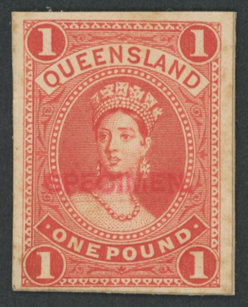 1882-95 QV Large Chalons £1 imperforate colour trial single in unadopted colour of vermilion-red, margins clear to good, very fine strike of an unusual sans-serif 'SPECIMEN.' Handstamp (26½x3mm) in rosine, affixed to a piece from a presentation mount, minor toning. Ex Bradbury Wilkson Archives and Bernie Manning: sold for $990 (Sale 146 Lot 1062). At the auction of the Archives, this item was part of Lot 2073, a display card bearing proofs from 15 entities, of which only two others bore the 'SPECIMEN.' handstamp. This card is referred to by Arthur Basset Hull at page 159 (Image1)