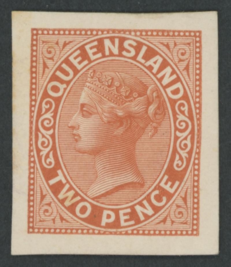 1882-95 QV Large Chalons 2/- colour trial single in unadopted colour of deep orange on ungummed unwatermarked wove paper, margins close to large, endorsed "Essay" in violet ink. Ex WG Gibson (Commonwealth Postmaster-General 1923-1929) and Bernie Manning: sold for $1165 (Sale 146 Lot 1068). This is the last of the four unapproved colours noted by Arthur Basset Hull. (Image1)