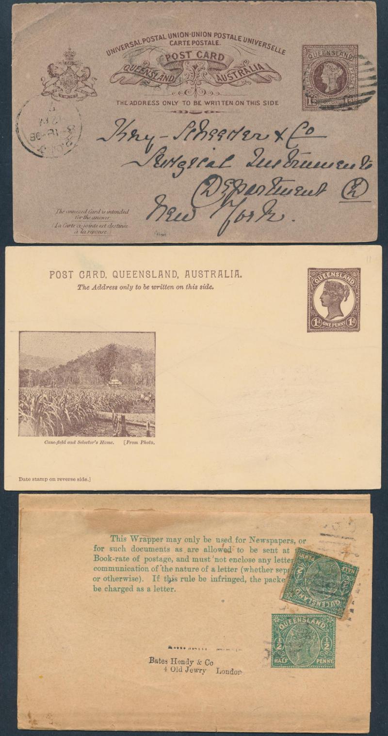 Modest collection with Postal Cards including about 20 scenic issues in fine to very fine mostly used and 1910 Black & White Views triptych of Maryborough CTO, four unfolded Letter Cards, unused STO Envelopes x8 and Wrappers x10, etc, condition variable.