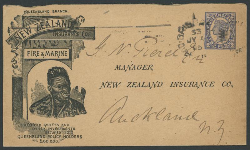 ENVELOPES - STAMPED TO ORDER: 1905 usage of QV Sidefaces White Background 2d blue HG KB5 on buff stock for New Zealand Insurance Co with Maori illustration, used 1905 to Auckland NZ with Brisbane duplex cancel, a little roughly opened at top. (Image1)