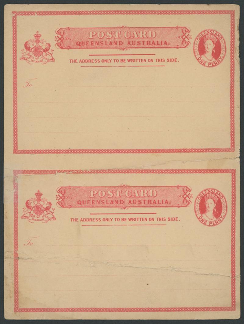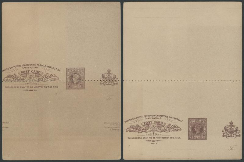 POSTAL CARDS: 1891 QV 1½d+1½d brown 'CARTE POSTALE' heading with Major Misplacement of the Design on Both Sides resulting in the Coat of Arms appearing at right instead of at left on both sides, the horizontal perforations cutting through the heading & indicia on the message side and the heading & indicia misplaced downwards on the reply side, light characteristic stock discolouration mostly on the message side & minor perf separation. With a normal card for comparison. A spectacular error.