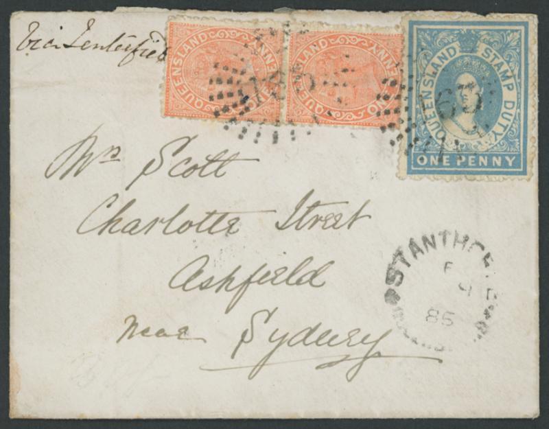 1885 cover to NSW with rare mixed franking of QV Second Sidefaces 1d pair and Postal Fiscals 1d blue SG F1 (unpriced on cover by Gibbons) tied by Rays '163' of 'STANTHORPE' (cds below), endorsed "via Tenterfield" (poor transit backstamp), Sydney transit & 'ASHFIELD/MR2/NSW' arrival backstamp, minor blemishes & light ironed-out crease across the stamps. Sold at our auction of 18.12.2010 for $873 (Sale 161 Lot 368). Scarce inland routing, by-passing Brisbane. Stanthorpe is 55km S of Warwick, close to the NSW border. (Image1)