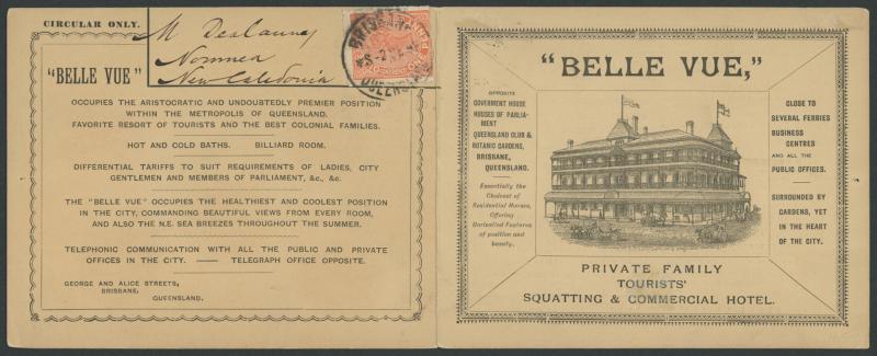 1892 illustrated fold-out advertising card for the Belle Vue Hotel in Brisbane, to New Caledonia with printed 'CIRCULAR ONLY' qualifying for the concessional 1d printed matter rate and QV Second Sidefaces 1d tied by Brisbane cds, pinhole at left where secured in transit, a couple of minor hinge remainders on the reverse otherwise superb. The only example we have seen. Sold at our auction of 17.2.2012 for $845 (Sale 171 Lot 562). (Image1)