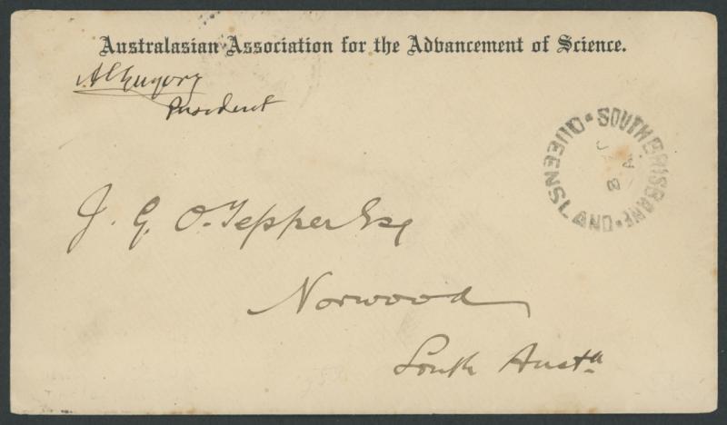 1895 (Jan 8) stampless cover with 'Australasian Association for the Advancement of Science' header over signature of "AC Gregory/President", to South Australia with 'TPO/A---/QUEENSLAND' & Adelaide transits and 'NORWOOD' arrival backstamp, very minor blemishes. A most unusual free-privilege cover. Ex Bernie Manning: sold for $359 (Sale 234 Lot 57). Sir Augustus Charles Gregory was an explorer, politician, philanthropist & masonic Grand Master. (Image1)
