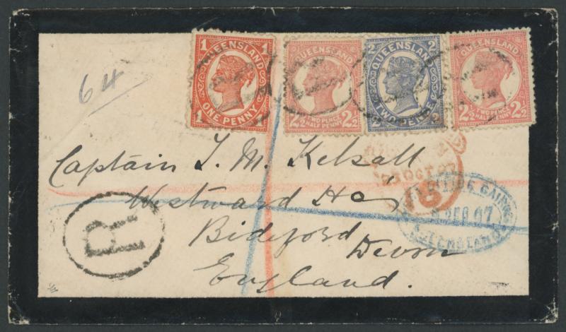 1897 double-rate mourning cover to Devon with QV Sidefaces mixed issue franking of Two Figures 2½d rose x2 and Four Figures 1d & 2d tied by 'R'-in-oval cancels, double-oval 'POST OFFICE CAIRNS/9SEP97/ QUEENSLAND' datestamp - believed to be the only recorded example - in blue below, minor blemishes. Sold at our auction of 24.11.2018 for $455 (Sale 231 Lot 541). (Image1)
