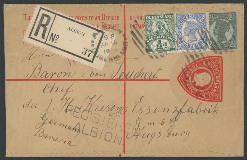 1909 (Apr 14) double-rate usage of McCorquodale KEVII 3d Registration Envelope to Bavaria (which was autonomous from Germany until 1918) with mixed reign franking QV Sidefaces ½d 2d & 2½d purple/blue added tied by BN '226', 'REGISTERED/ALBION' handstamp (rated RRR) plus rare black/white 'ALBION' R label tied by 'ALBION' cds, Brisbane transit backstamp. Superb. Ex Bernie Manning: sold for $868 (Sale 234 Lot 233).