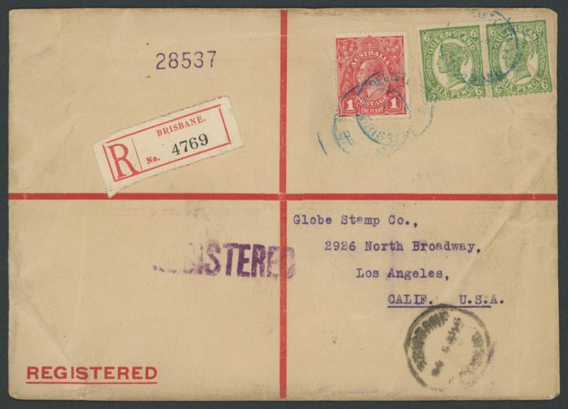 1916 (June 7) slightly oversized envelope (175x125mm) with pre-printed 'REGISTERED' & crossed lines in red to USA with WH Robinson Stamp Dealer label on the reverse and combination franking of Queensland QV Sidefaces 6d green pair and Australia KGV 1d red tied by Brisbane Registered cds cancels in blue with red & black/white R label alongside on the face, US 'REGISTERED' handstamp in violet & '28537' registration number on the face and San Francisco 'JUL/2/1916' arrival backstamp, a few minor bends lightly affecting one of the 6d stamps. The rate was 2½d per ½oz foreign letter x4 plus 3d registration fee. (Image1)