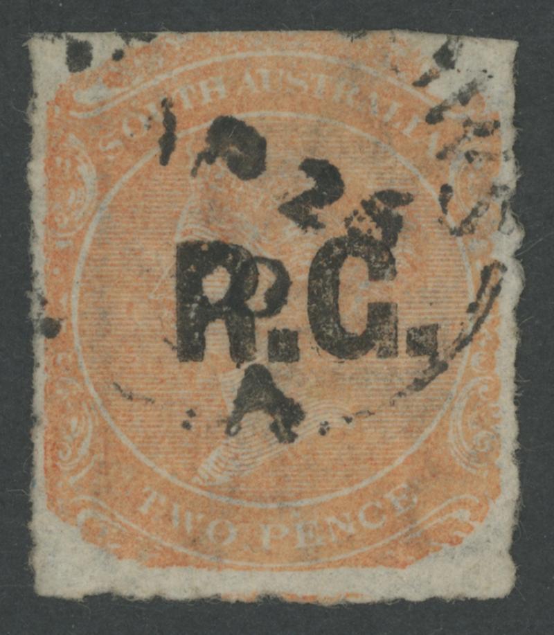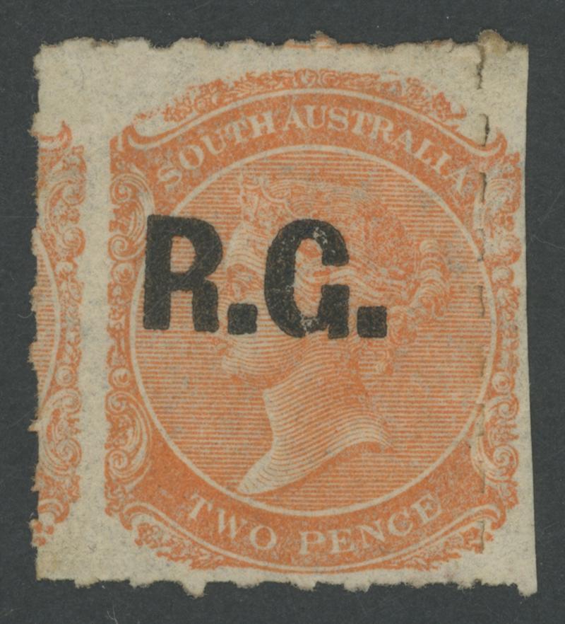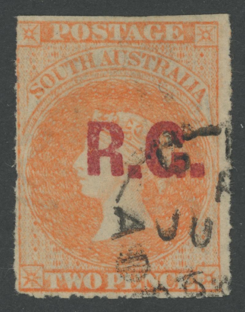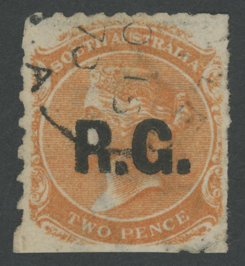 BLACK OVERPRINT: 'R.G.' on QV De La Rue Crown/SA Wmk Irregular Compound Perf 11½-12½x11½-12½x10x11½-12½ 2d dull orange SG 487, indistinct cancel, Cat £100. Rated R; unrecorded unused. Superior to Don Pearce's example - Perf 11½-12½x10x10x10 - that sold for $137 (Sale 247 Lot 671). (Image1)