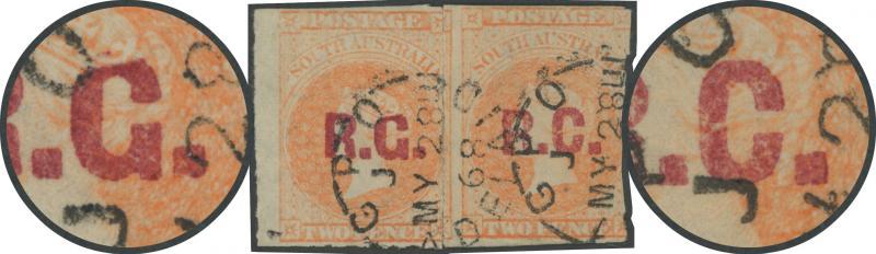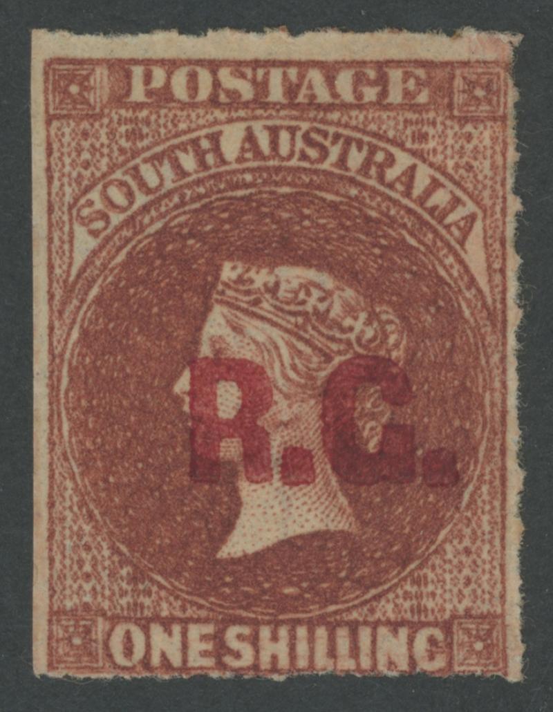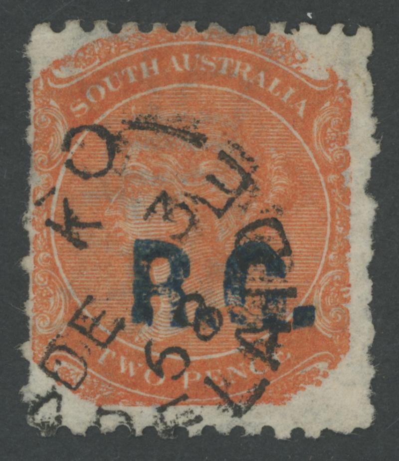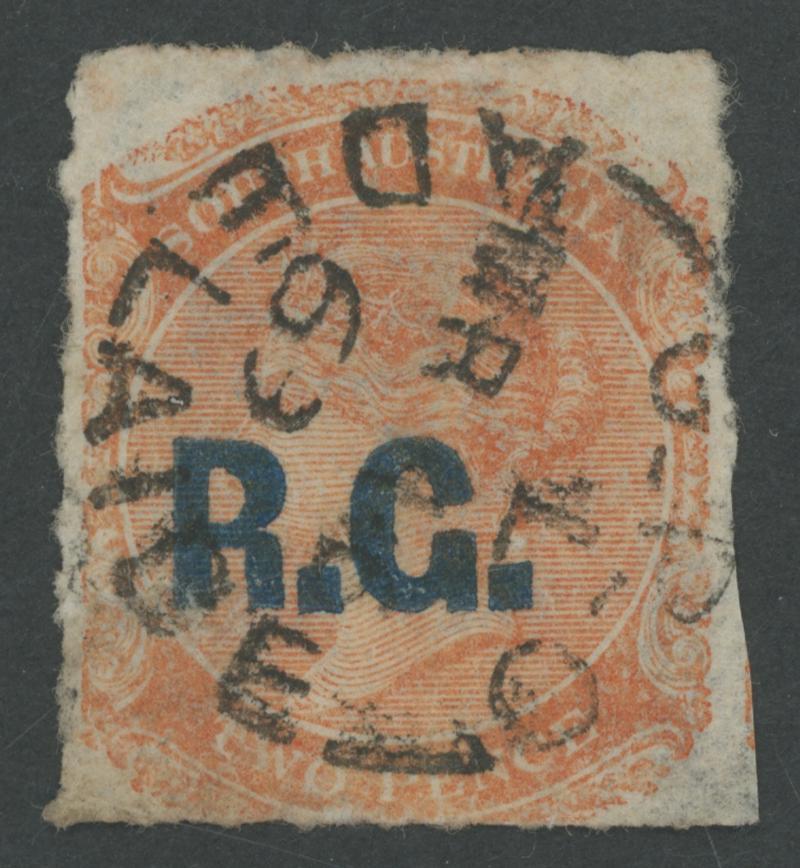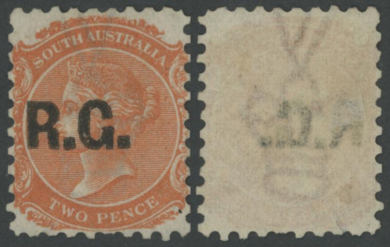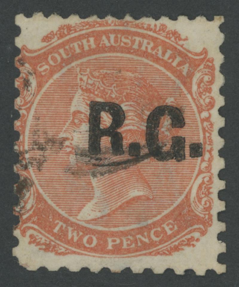 BLACK OVERPRINT: 'R.G.' on QV De La Rue Crown/SA Wmk Irregular Compound Perf 11½-12½x11½-12½x10x11½-12½ 2d dull orange SG 487, indistinct cancel, Cat £100. Rated R; unrecorded unused. Superior to Don Pearce's example - Perf 11½-12½x10x10x10 - that sold for $137 (Sale 247 Lot 671). (Image1)