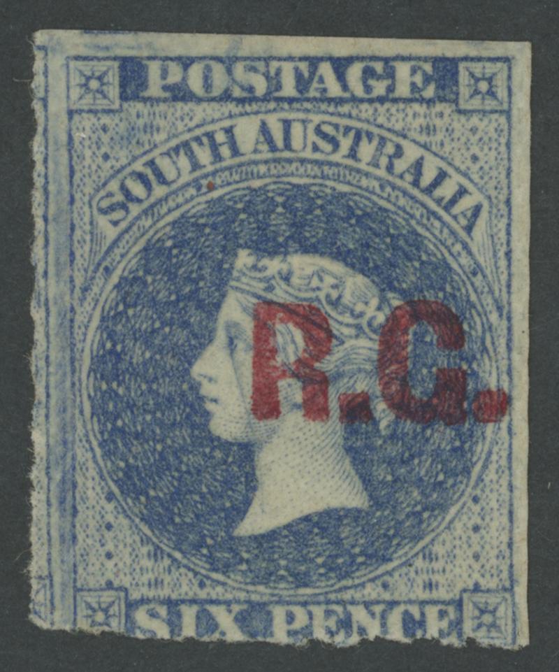 RED OVERPRINT: 'R.G.' on QV Perkins Bacon Large Star Wmk Rouletted 6d dull ultramarine SG DO475 with Deformed 'G' in 'R.G.', rouletting at the sides & cut from the sheet clear of the design at top & base, a couple of faint blemishes, superb large-part gum, Cat £1700+. Rated RRRR+. Ex Don Pearce: sold for $2995 (Sale 247 Lot 652). The 'Besancon' example - with undamaged 'G' - sold for SFr2300. (Image1)