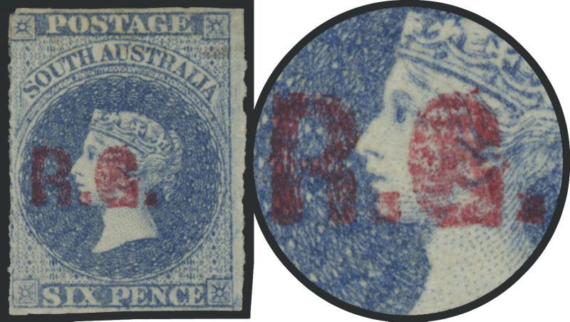 RED OVERPRINT: 'R.G.' on QV Perkins Bacon Large Star Wmk Rouletted 6d dull ultramarine SG DO475, rouletting on all sides but cut from the sheet except at the base to preserve the design, superb large-part gum, Cat £1750. Rated RRRR. Ex Colonel Napier (I). Chris Ceremuga Certificate (2019) states "extremely rare...original gum...superb and fresh". The similar 'Besancon' example sold for SFr2300. Don Pearce's example with Deformed 'G' - "a couple of faint blemishes" - sold for $2995 (Sale 247 Lot 652). (Image1)