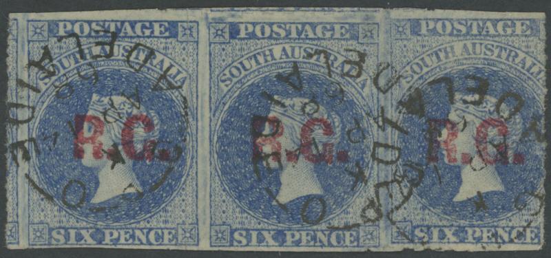RED OVERPRINT: 'R.G.' on QV Perkins Bacon Large Star Wmk Rouletted 6d dull ultramarine SG DO475 horizontal strip of 3, rouletting on all sides & between the units and cut from the sheet in places clear of the design, GPO cds of 'AP14/68'. Rated RRR+. Ex Don Pearce: sold for $895. (Sale 247 Lot 653). A scarce & attractive multiple. [Date range 8.4.1868 to 18.8.1870] (Image1)
