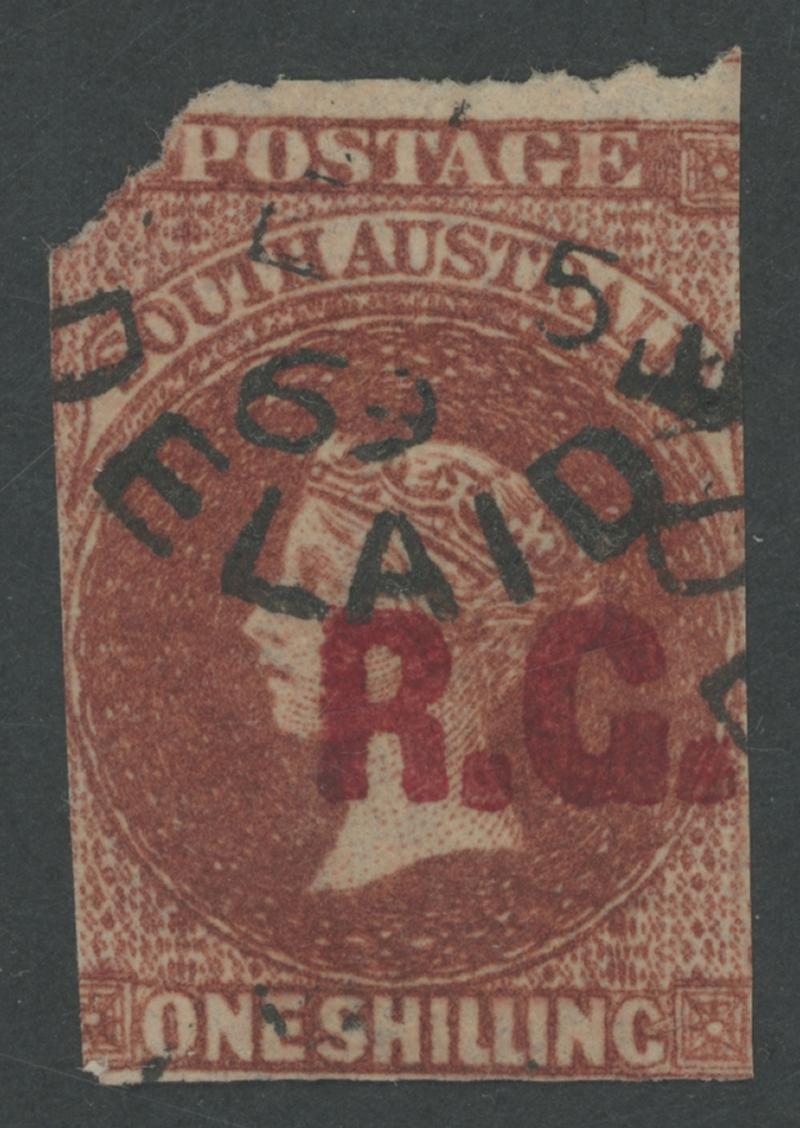 BLACK OVERPRINT: 'R.G.' on QV De La Rue Crown/SA Wmk Perf 10xRouletted 2d orange SG 483 with the Watermark Reversed, cut from the sheet at the base clear of the design, light GPO cds of 'NO16/70', Cat £350. Rated RR; unrecorded unused. Don Pearce's similar example sold for $625 (Sale 247 Lot 666). [Date range 16.11.1870 to 14.3.1871] (Image1)