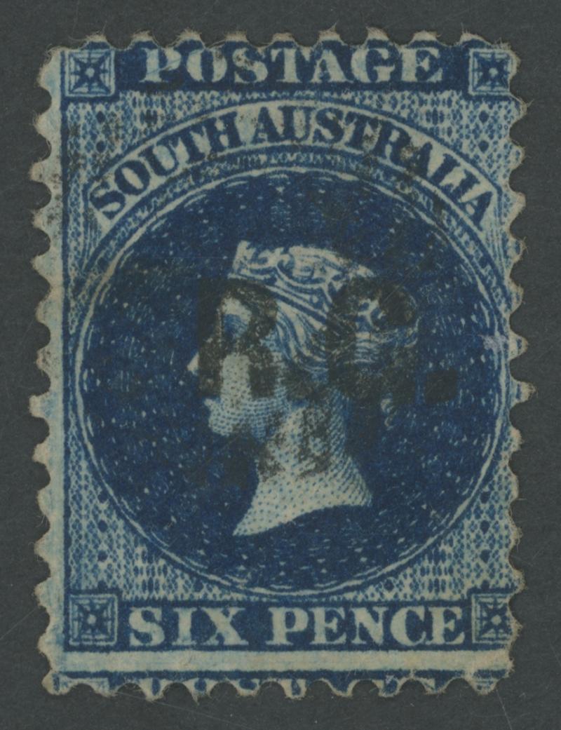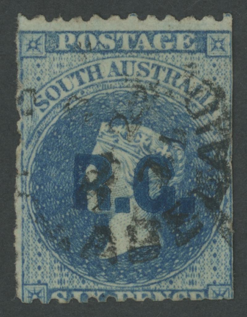 BLUE OVERPRINT: 'R.G.' on QV Perkins Bacon Large Star Wmk Perf 11½-12½xRouletted 6d dull blue SG DO479, cut from the sheet just clear of the design at right, untidy GPO cds, Cat £200. Rated RR; unrecorded unused. Ex Les Munn: sold for $405 (Sale 110 Lot 887). Don Pearce's similar example sold for $335 (Sale 247 Lot 663). [Date range 9.5.1871 to 23.7.1872] (Image1)