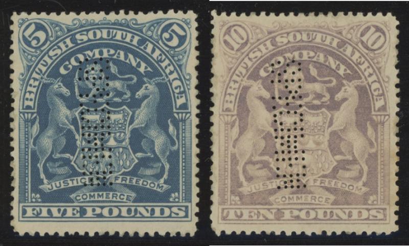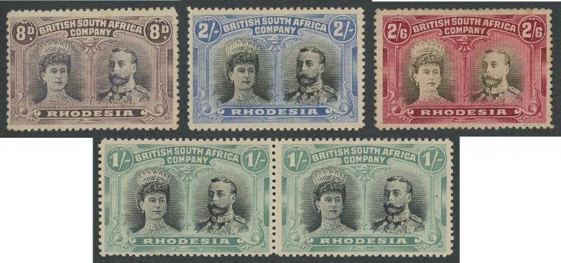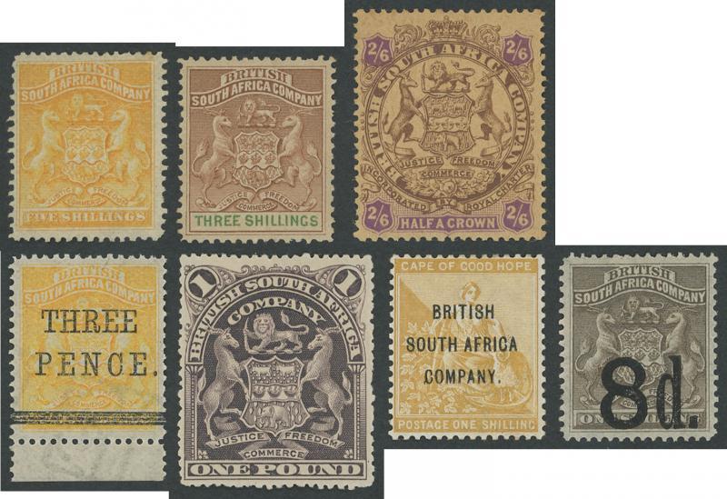 Mint selection mostly 19th Century including 1892-93 BSAC Arms to 10/- including both colours of the 6d & 2/6d, 1892 Surcharges ½d on 6d & 8d on 1/-, 1892-94 Bi-Coloured Arms set plus extra 3/- & 4/-, 1896-87 Large Arms Shaded Lion set to 5/-, 1896 Matabele Surcharges 'THREE/PENCE' on 5/- and Overprints on Cape of Good Hope set plus extra 4d x2 & 6d, 1898-1908 Monocolour Arms £1 purple & £2 brown, 1905 Victoria Falls set to 2/6d, etc, condition a little variable, a few with minor blemishes and/or aging marks, but most are fine to very fine, Cat £3500+.