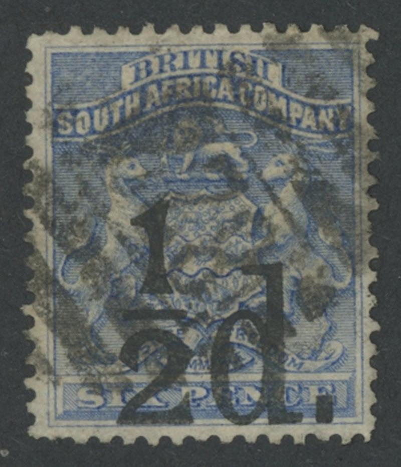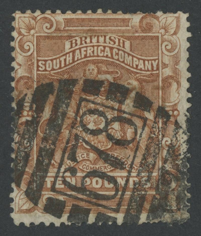 1892-93 British South Africa Company Arms £10 brown SG 13, wayward centring as usual, a few slightly uneven perfs, postally used with superb almost complete strike of '678' numeral in bars of Bulawayo (recorded 10.11.1888 to 1.8.1891 only; latest recorded use), Cat £800. See also Lot 2392 below. (Image1)