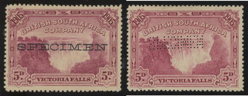 1905 Victoria Falls Bridge 5d claret with 'SPECIMEN' overprint (29mm) SG 96s, quite well-centred, hinge remainder, plus 5d claret punctured 'SPECIMEN' (inverted), no gum, Cat £170+ for the overprint only. (2) (Image1)