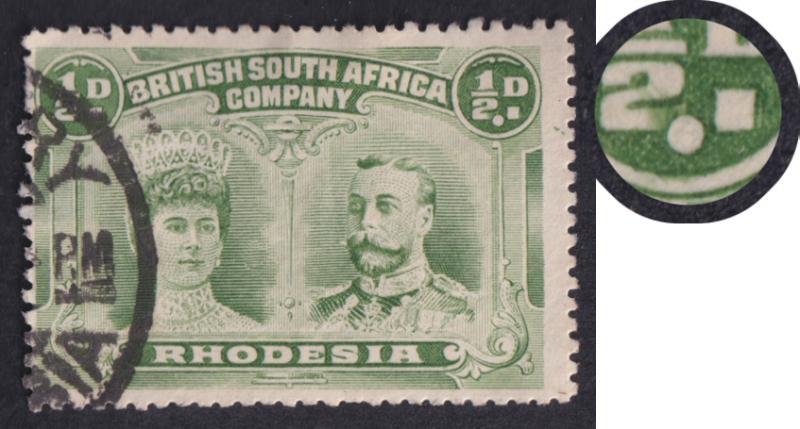 1910-13 KGV Double Heads Perf 14 ½d yellow-green SG 119 block of 4, the upper two units both with 'Wedge Flaw' in the Lower Left Frame [Pos 6-7], four neat light strikes of 'LIVINGSTONE/20.AUG.1913/ N.W.RHODESIA' double-ring cds well clear of the varieties. A scarce postally used multiple. (Image1)