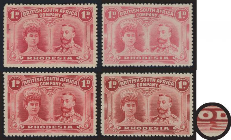 Bulawayo (2): 'M.O. EXCHANGE/-2.JUL.1913/BULAWAYO' [Money Order] double-ring cds (Proud D195), four very fine part-strikes of which one is almost complete on Double Heads 1d carmine-lake block of 4. PO 1888; closed 15.10.1893; re-opened by early 1894. Proud states "Usually used on money orders etc". Handbook Extremely Rare. (Image1)