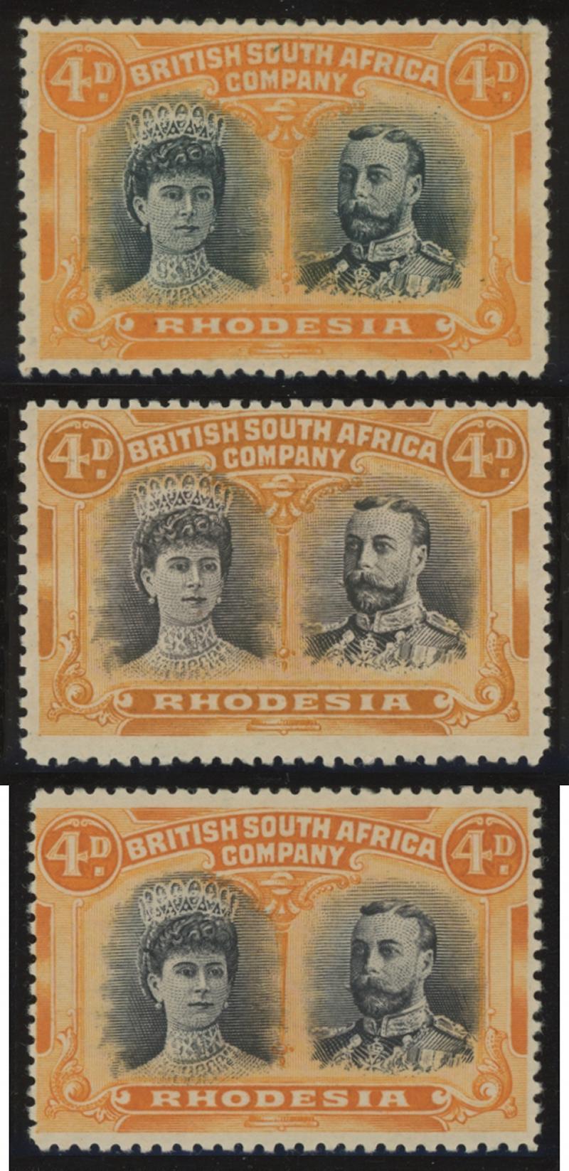 1910-13 KGV Double Heads Perf 14 4d greenish-black & orange SG 138-140, quite well-centred, small hinge remainder, plus 4d brown-purple & orange and 4d black & orange, both lightly mounted, Cat £265. (3) (Image1)