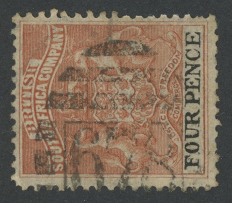 Bulawayo (1): '678' numeral in bars (Proud K1; recorded 10.11.1888 to 1.8.1891 only; latest recorded use), largely very fine large-part strike (numerals almost complete) on 1892-94 Small Bi-Colour Arms 4d black & chestnut. PO 1888; closed 15.10.1893; re-opened by early 1894. The PO was moved from Dawson's Store on 15.10.1893 when this was abandoned due to the Matabele War; it was re-established in the new township which sprung up after the BSAC troops captured the Matabele Gubulawayo Kraal on 4.11.1893, and later moved 3 miles south where the new Bulawayo PO was declared open on 1.6.1894. The '678' cancel is not known used after the Matabele War, and was possibly lost in the move. (Image1)