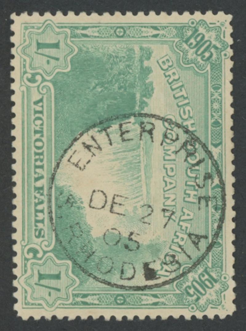 Enterprise: 'ENTERPRISE/DE 27/05/S.RHODESIA' single-ring cds (Proud D2), largely very fine complete strike on Victoria Falls 1/- green, Cat £50. PA 21.2.1899; closed 1.10.1911. Re-opened as Goromonzi PA 1.11.1911. [Postal Agency under Arcturus, Southern Rhodesia. Runner Mail to Salisbury] (Image1)