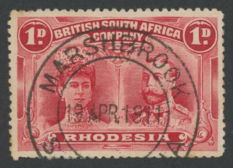 Marshbrook: 'MARSHBROOK/19.APR.1911/S[.RHODES]IA' double-ring cds (Proud D5), very fine large-part strike on Double Heads 1d carmine-lake. Handbook Uncommon. Renamed from Charter POA 1.1.1911; closed 5.7.1917. [Postal Agency under Salisbury, Southern Rhodesia. Runner Mail] (Image1)