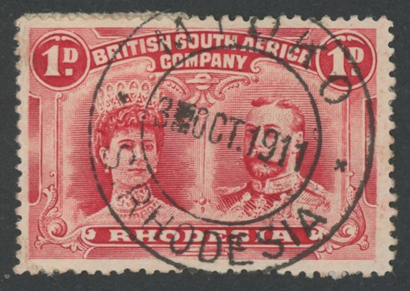 Mtoko (1): 'MTOKO/3♦.OCT.1911/S.RHODESIA' double-ring cds (Proud D2), largely very fine large-part strike on Double Heads 1d carmine-lake. Matokos PA circa 1902; renamed Mtoko -.1908; MO & TO 14.7.1913; PA 25.2.1915; closed 23.11.1920; PA re-opened 7.11.1921; MO & TO 1.11.1928. Handbook Scarce (but unlisted with blank after day). [Postal Agency under Macheke, Southern Rhodesia. Runner Mail] (Image1)