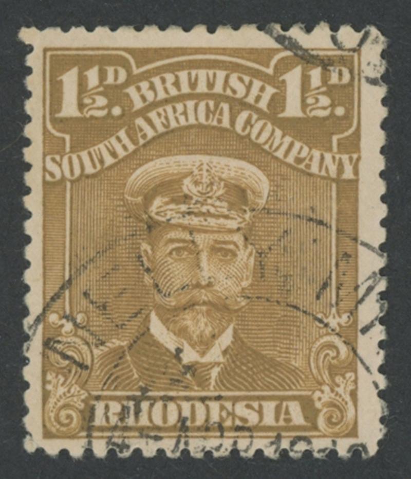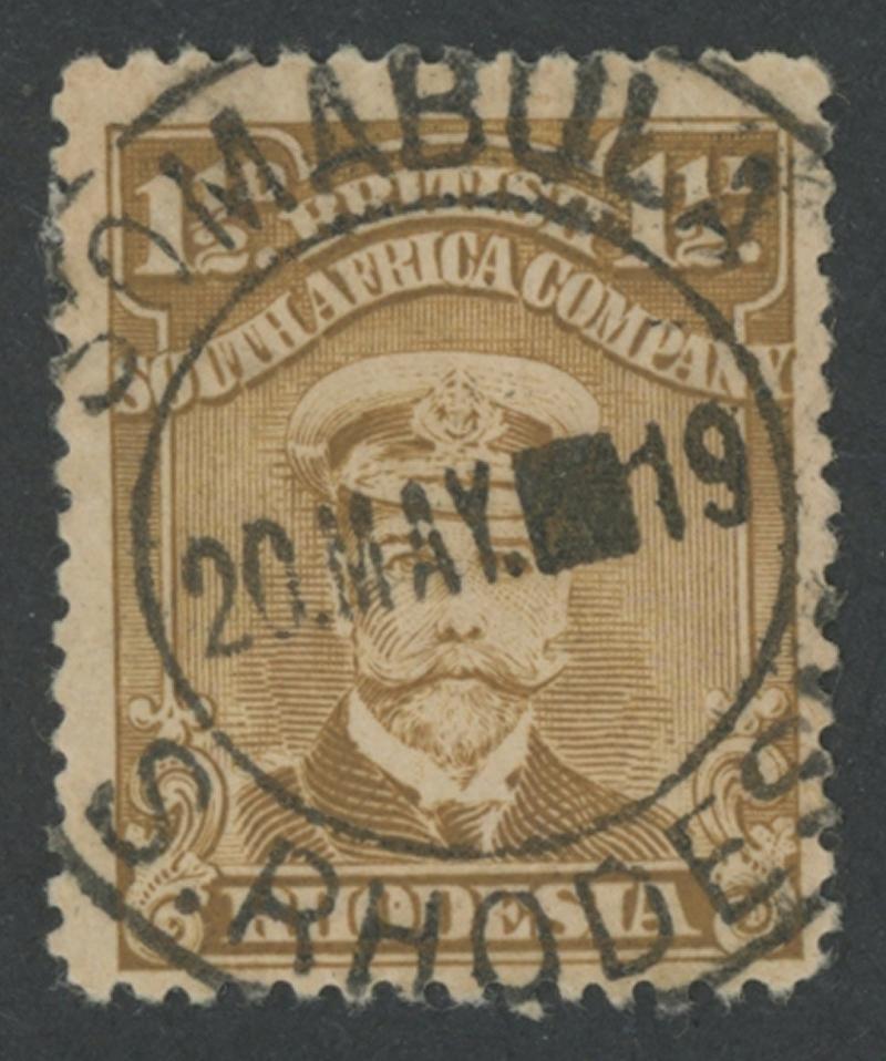 Somabula (2): 'SOMABULA/20.MAY.♦♦19/S.RHODES[IA]' double-ring cds (Proud D3), very fine large-part strike on BSAC KGV Admirals 1½d brown. PA 23.7.1914; closed 1.1.1917; re-opened 1.2.1917; closed 10.12.1919; re-opened 29.5.1922. Handbook Extremely Rare (only 2 examples recorded with blank before 2-digit year). [Postal Agency under Gwelo, Southern Rhodesia] (Image1)
