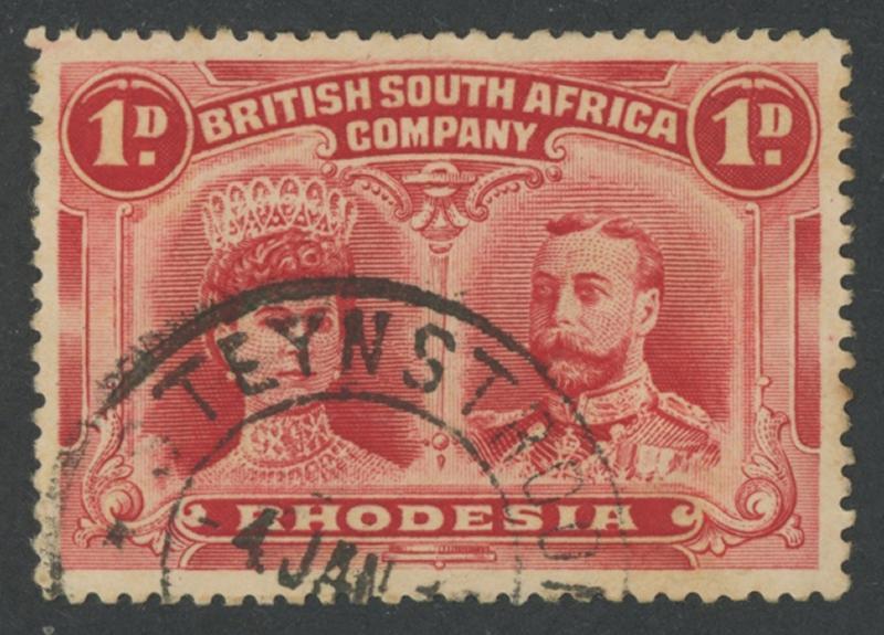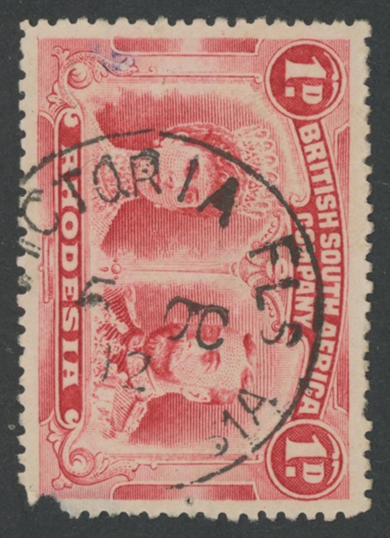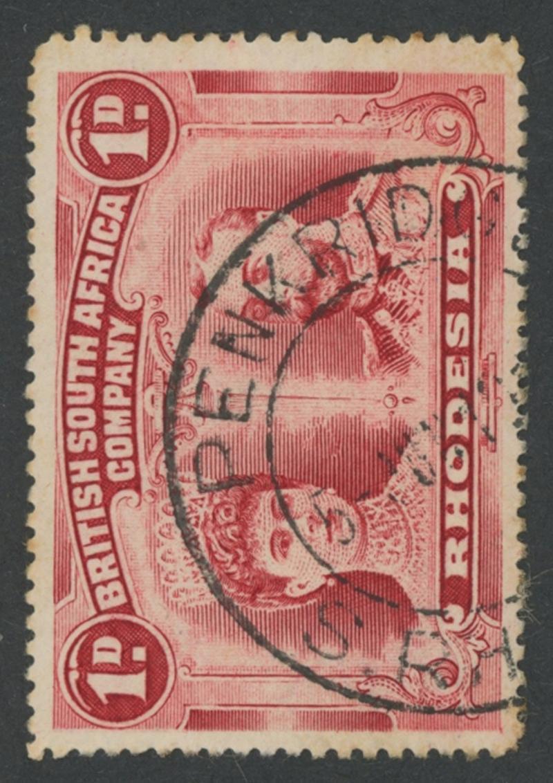 Penkridge: 'PENKRIDGE/5-.JUN.19[??]/S.RH[ODESIA]' double-ring cds (Proud D2), very fine partial strike on Double Heads 1d carmine-lake. PO 1.9.1911; closed 31.5.1934. Handbook Rare. [Melsetter District, Southern Rhodesia] (Image1)
