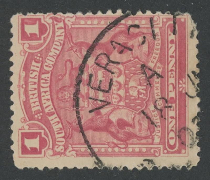 Veracity: 'VERACITY/A/18 JN/03/S[.RHODESIA]' single-ring skeleton relief cds (Proud D1), very fine partial strike on BSAC Arms 1d rose (rounded corner at lower-right). PA 31.3.1902; closed 19.10.1903. Later re-opened as Veracity Mine circa 1909. [Postal Agency under Gwelo in the Lower Gwelo District. Runner Mail from Gwelo] (Image1)